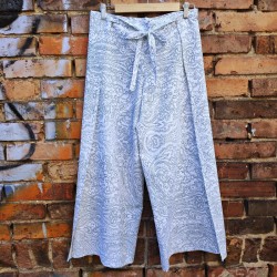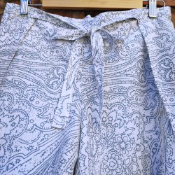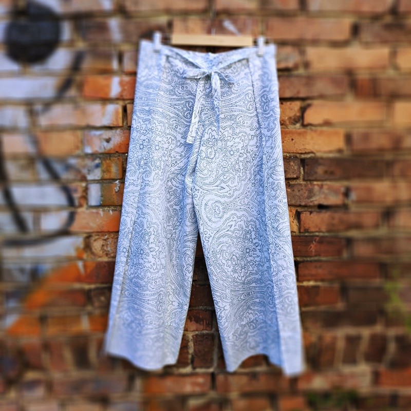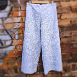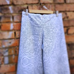 Tutaj: egzeplarz pierwszy. Spodnie uszyte z tkaniny bawełnianej w niebieski wzór, ornament. Tkanina pochodzi z kompletu pościelowego ;)