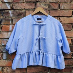 Urocza koszula wiązana na troczki. Rękawy z bufkami, krój prosty oversize z baskinką.