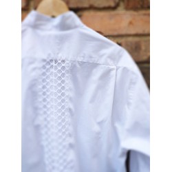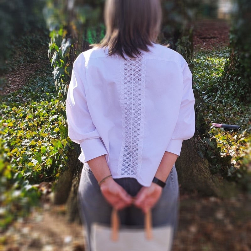 Tu: koszula o prostym kroju oversize, rękawy bufki zakończone mankietem. Na plecach koronka bawełniana. Materiał: bawełna.