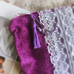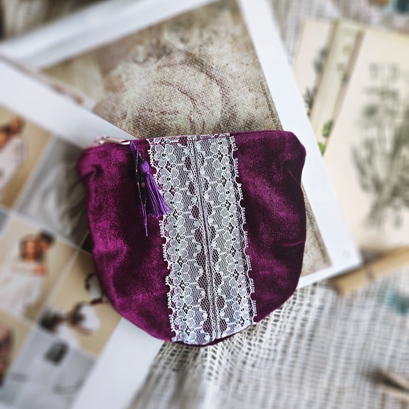 Kosmetyczka uszyta z bordowego weluru z bawełnianą podszewką. Przy zamku ozdobny chwościk ze szklanymi koralikami. Wymiary ok 14 x 14 cm.
