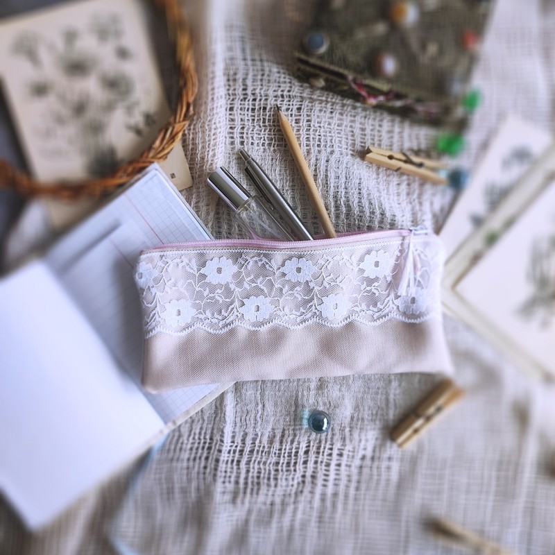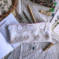 Kosmetyczka / piórnik z delikatną koronką uszyta została z tkaniny tapicerskiej. Wewnątrz podszewka bawełniana. Wymiary ok 20 x 9 cm.