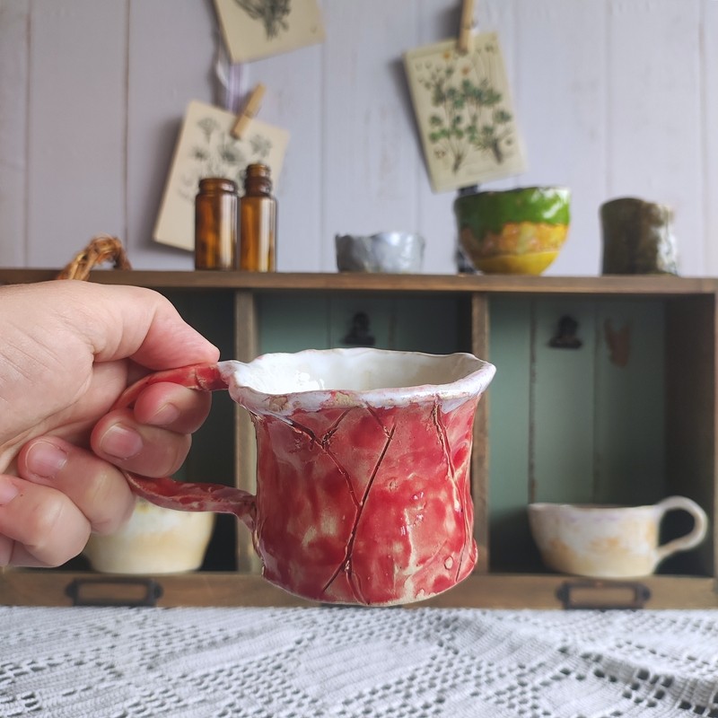 Tu: kubeczek do espresso z dużym uchem. Wymiary: wysokość 6 cm, średnica ok 7 cm.